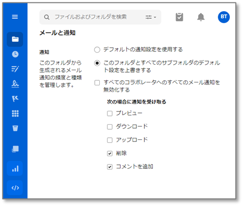 フォルダ設定画面を開き、「通知」でプレビュー/ダウンロード/アップロード/削除/コメントの追加 から、受け取りたい通知選び、[変更を保存] をクリックします。
