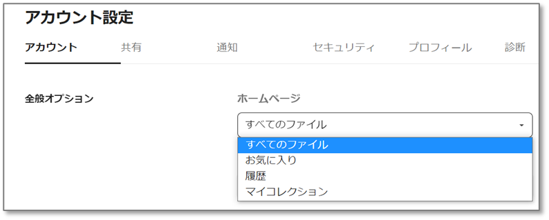 アカウント設定 > アカウント で、Boxへのログイン時に表示するホームページを「お気に入り」や「マイコレクション」に変更できます。