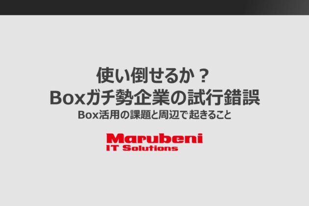 2024年6月25日火曜、東京芝公園 ザ・プリンス パークタワー東京で開催されたBoxWorks Tokyo 2024で 丸紅ITソリューションズのソリューション事業本部に所属する エース2名が、キーノート直後の時間帯に講演した 「使い倒せるか?Boxガチ勢企業の試行錯誤。Box活用の課題と周辺で起きること」セッションの資料を 本番当日に使ったそのままご提供します。