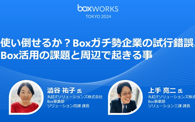 2024年6月25日火曜、東京芝公園 ザ・プリンス パークタワー東京で開催されたBoxWorks Tokyo 2024で 丸紅ITソリューションズのソリューション事業本部に所属する エース2名が、キーノート直後の時間帯に講演した 「使い倒せるか?Boxガチ勢企業の試行錯誤。Box活用の課題と周辺で起きること」セッションのフル動画です。