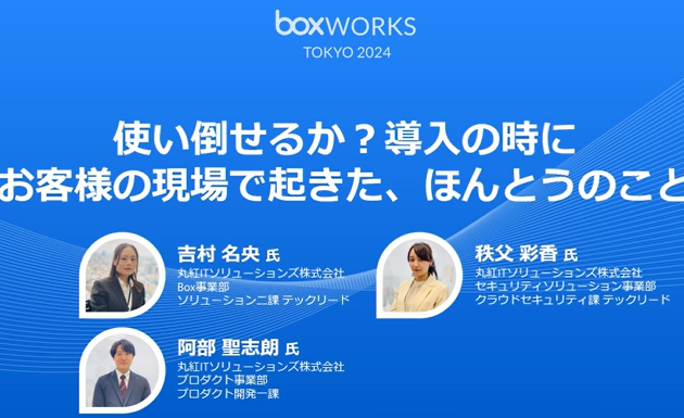 2024年6月25日火曜、東京芝公園 ザ・プリンス パークタワー東京で開催されたBoxWorks Tokyo 2024で 丸紅ITソリューションズのソリューション事業本部に所属する 若手3名が、キーノート直前の時間帯に講演した 「使い倒せるか?導入の時にお客様の現場で起きた、ほんとうのこと」セッションのフル動画です。