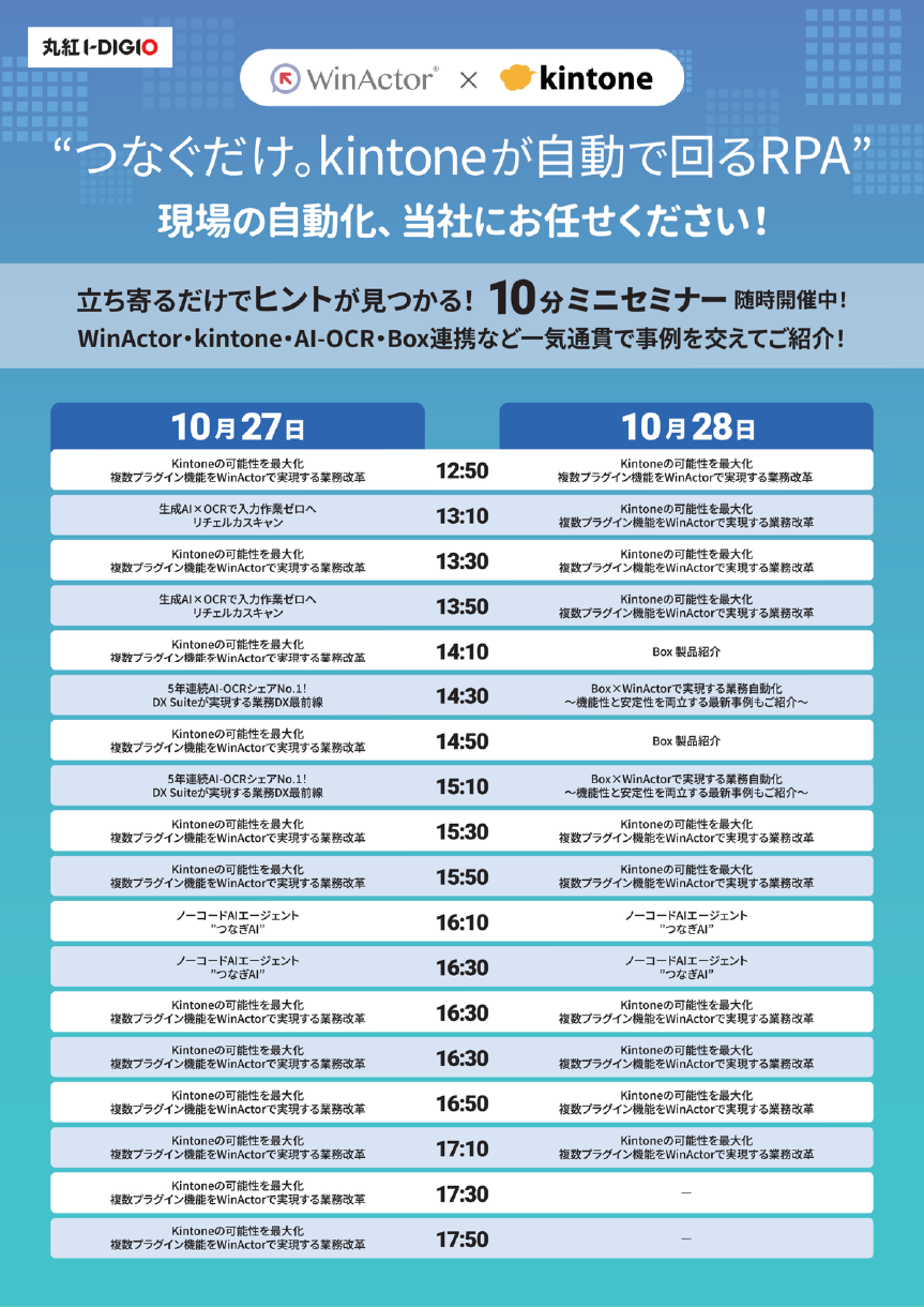 弊社ブースでは、kintoneとWinActorをAPI連携する「WinActor for kintone」を中心に、AI-OCRやBox連携など、業務自動化の最新事例を一気通貫でご紹介いたします。