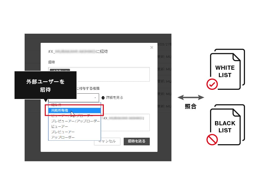 外部招待を受ける際、招待元のアカウントのドメインをホワイトリスト・ブラックリストを用いて制限する仕組みです。本機能はBox Governanceと異なり、招待は一時的になされますが、ポリシーに従わない招待の場合は、一定間隔後に自動解除されます。